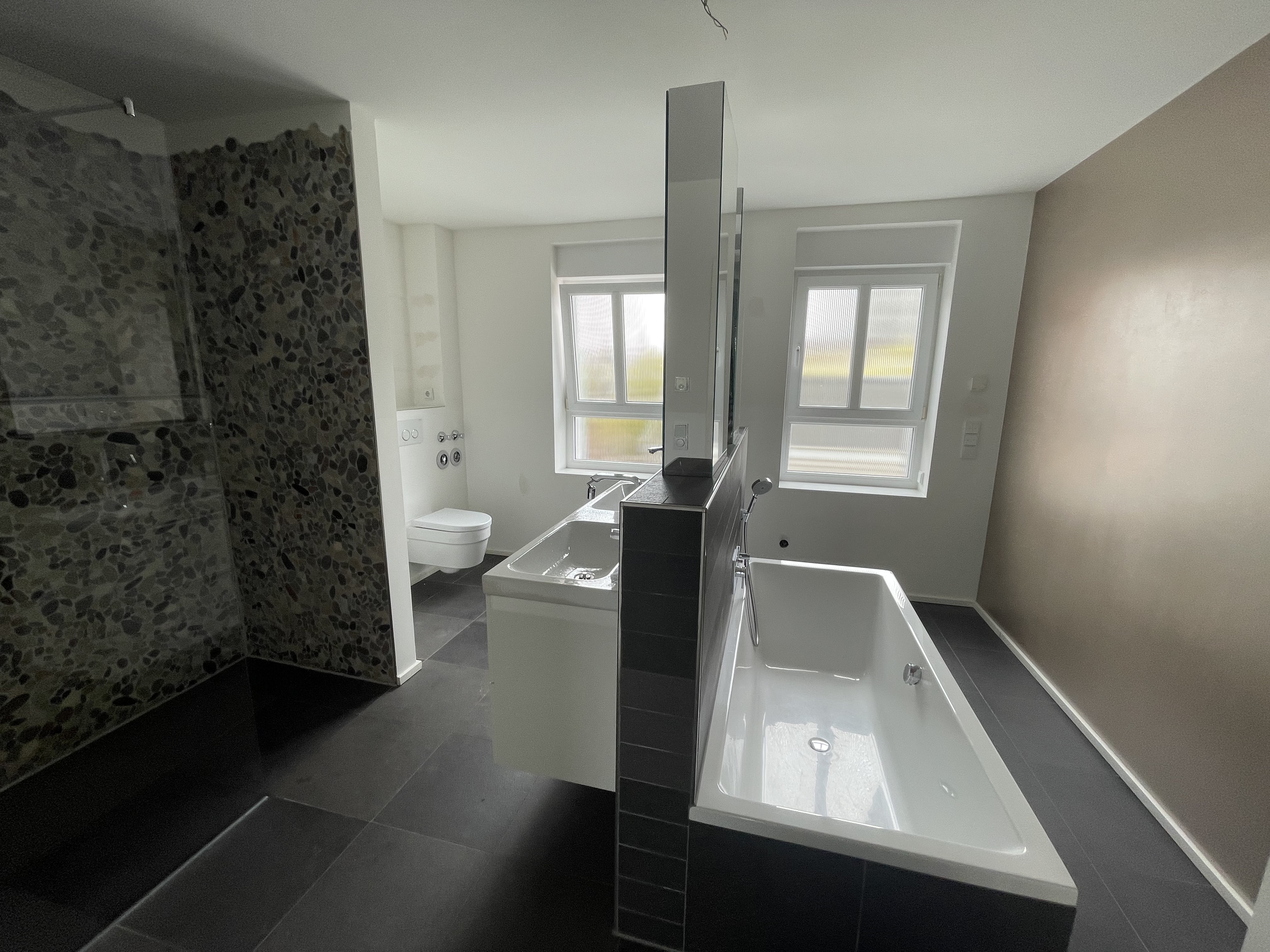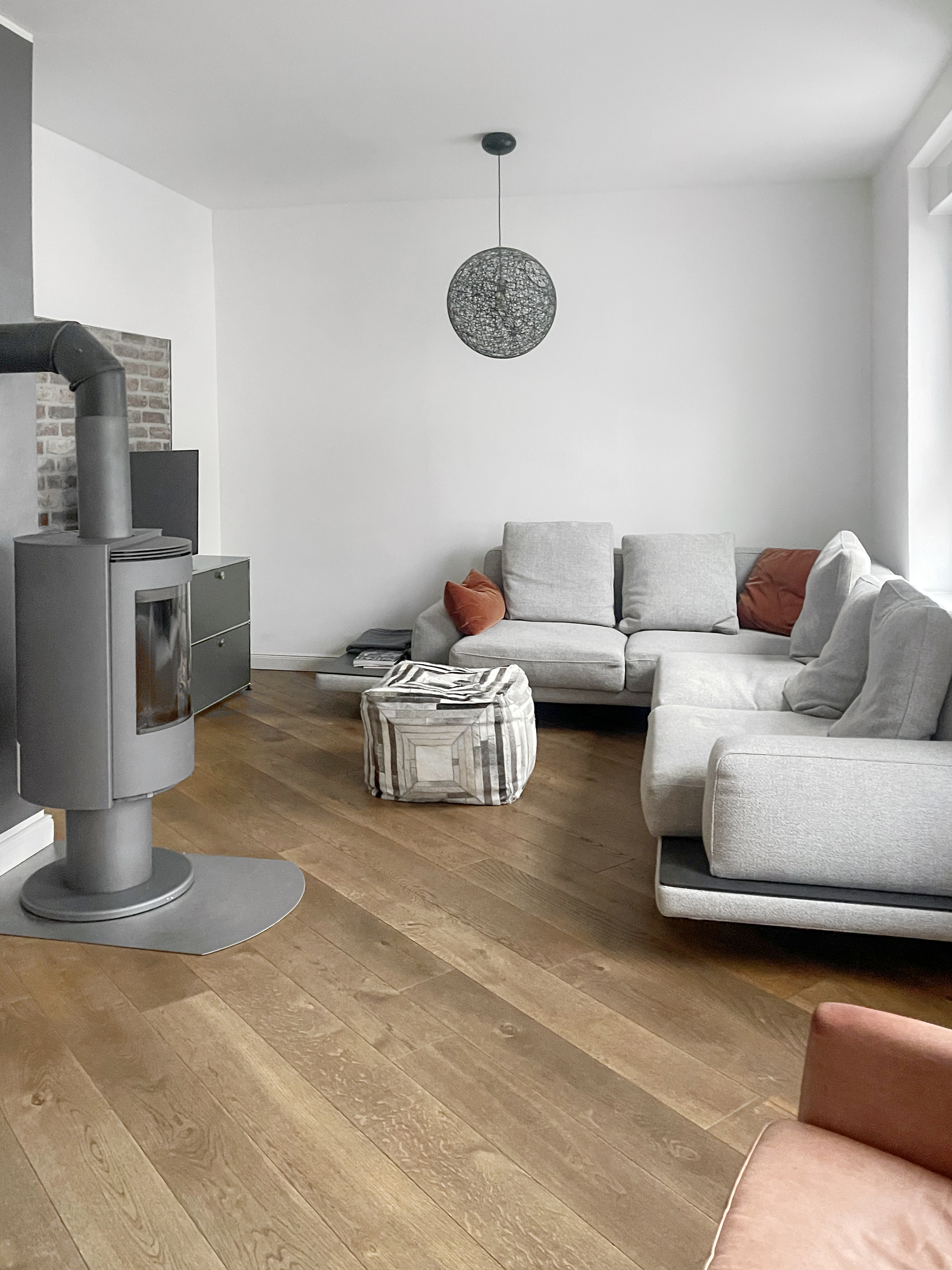 Im 1. OG findet sich ebenfalls eine helle, schicke 2-3-Zimmerwohnung mit G-WC( ein Bad kann ohne großen Aufwand eingebaut werden, Anschlüsse sind vorhanden) und offener Küche mit gr. Schiebetüren-Zugang zu der nach Südost ausgerichtete große Terrasse mit hochwertigem Bangkirai-Holzbodenbelag und eleganter Außentreppe in den Garten, sowie der moderne, schwenkbare Kaminofen im Wohnzimmer.