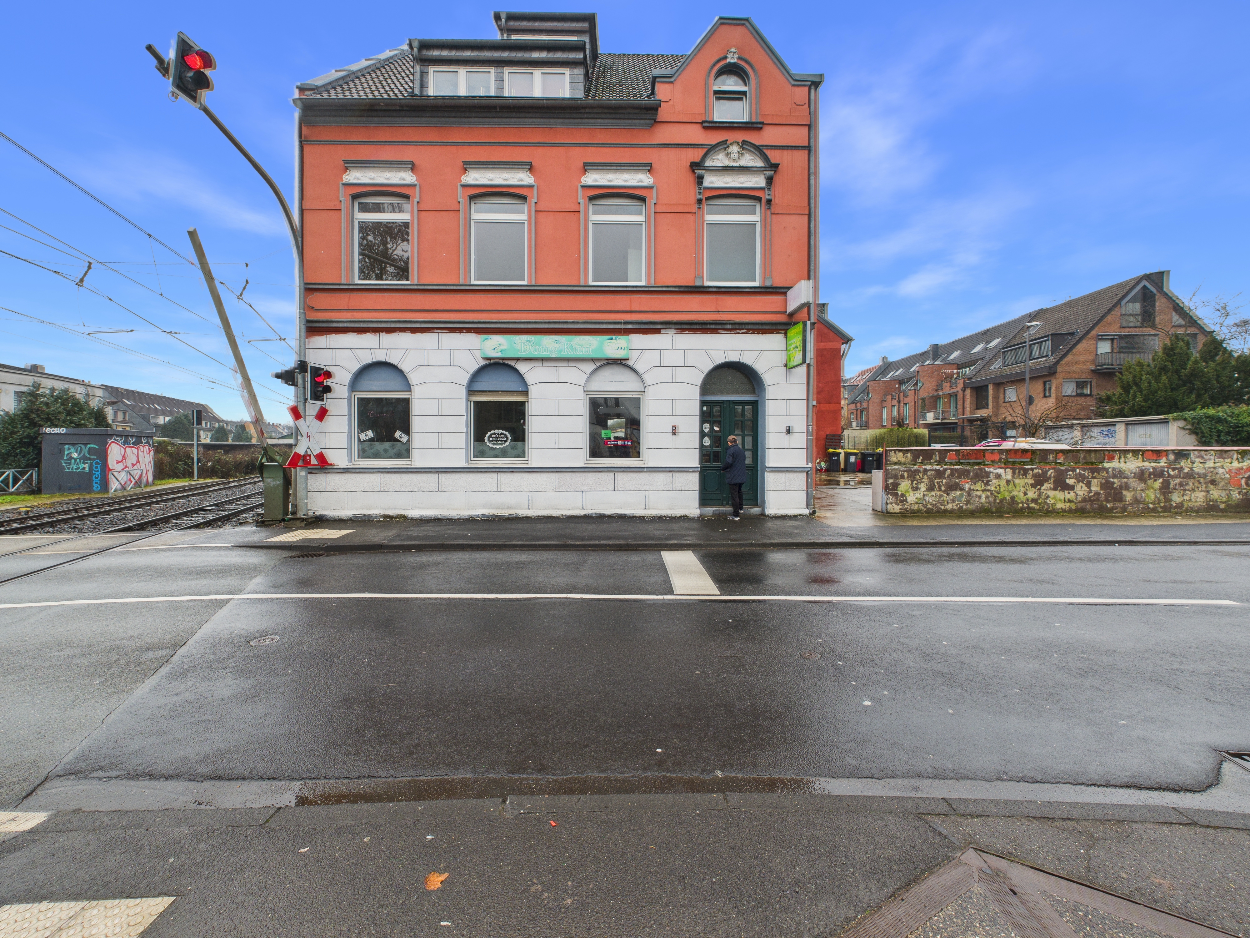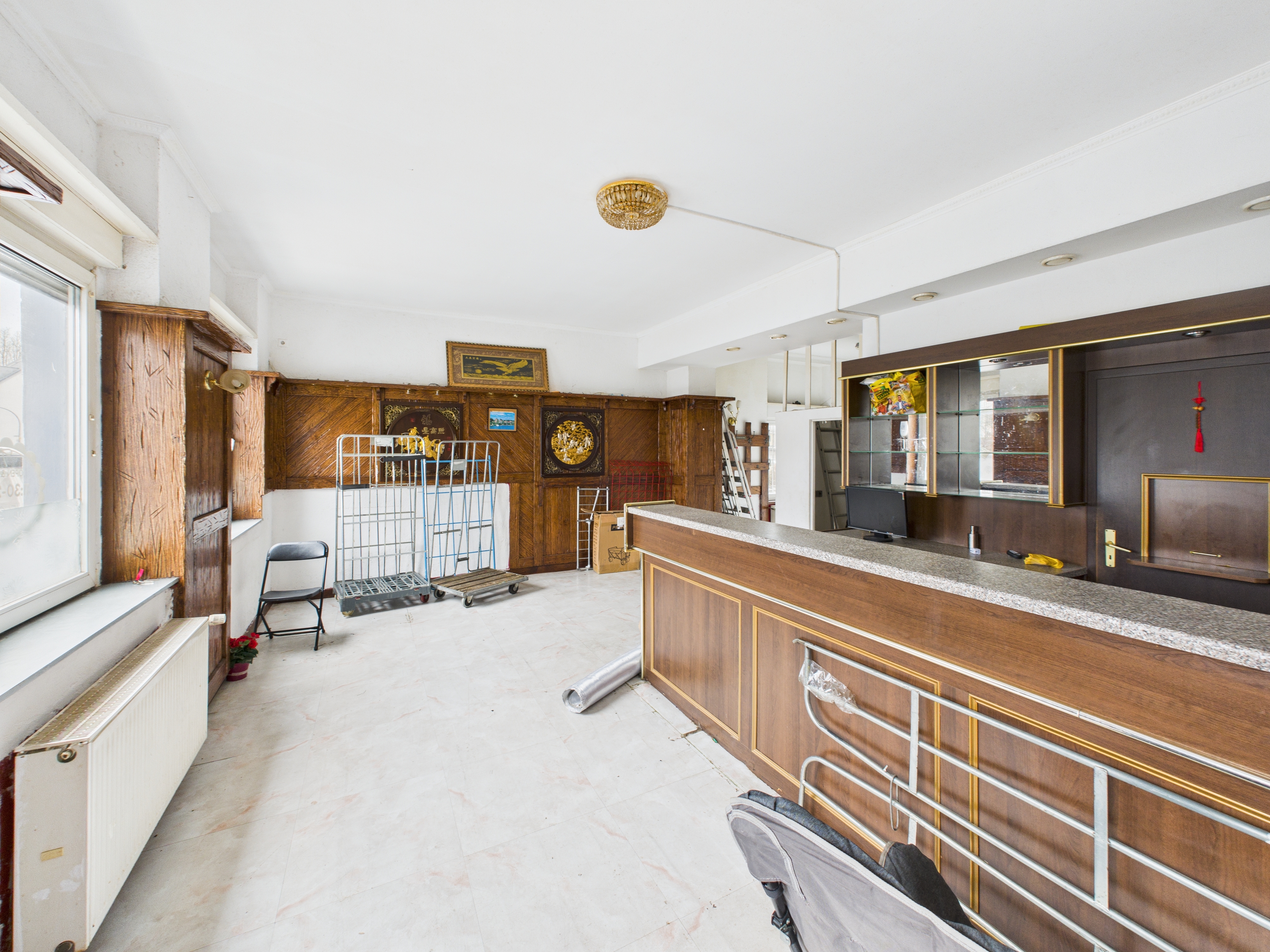 Im Erdgeschoss befindet sich eine großzügige Gewerbefläche, von ca. 94qm, die früher als Restaurant genutzt wurde. Das Restaurant ist derzeit nicht in Betrieb, steht leer und befindet sich ebenfalls in einem stark renovierungsbedürftigen Zustand. Hier ist umfangreiche handwerkliche Arbeit erforderlich, gleichzeitig bietet sich die Chance, die Fläche vollständig nach eigenen Vorstellungen zu gestalten – sei es für einen neuen Gastronomiebetrieb, ein anderes Gewerbe oder zur späteren Vermietung mit attraktiven Ertragsmöglichkeiten.