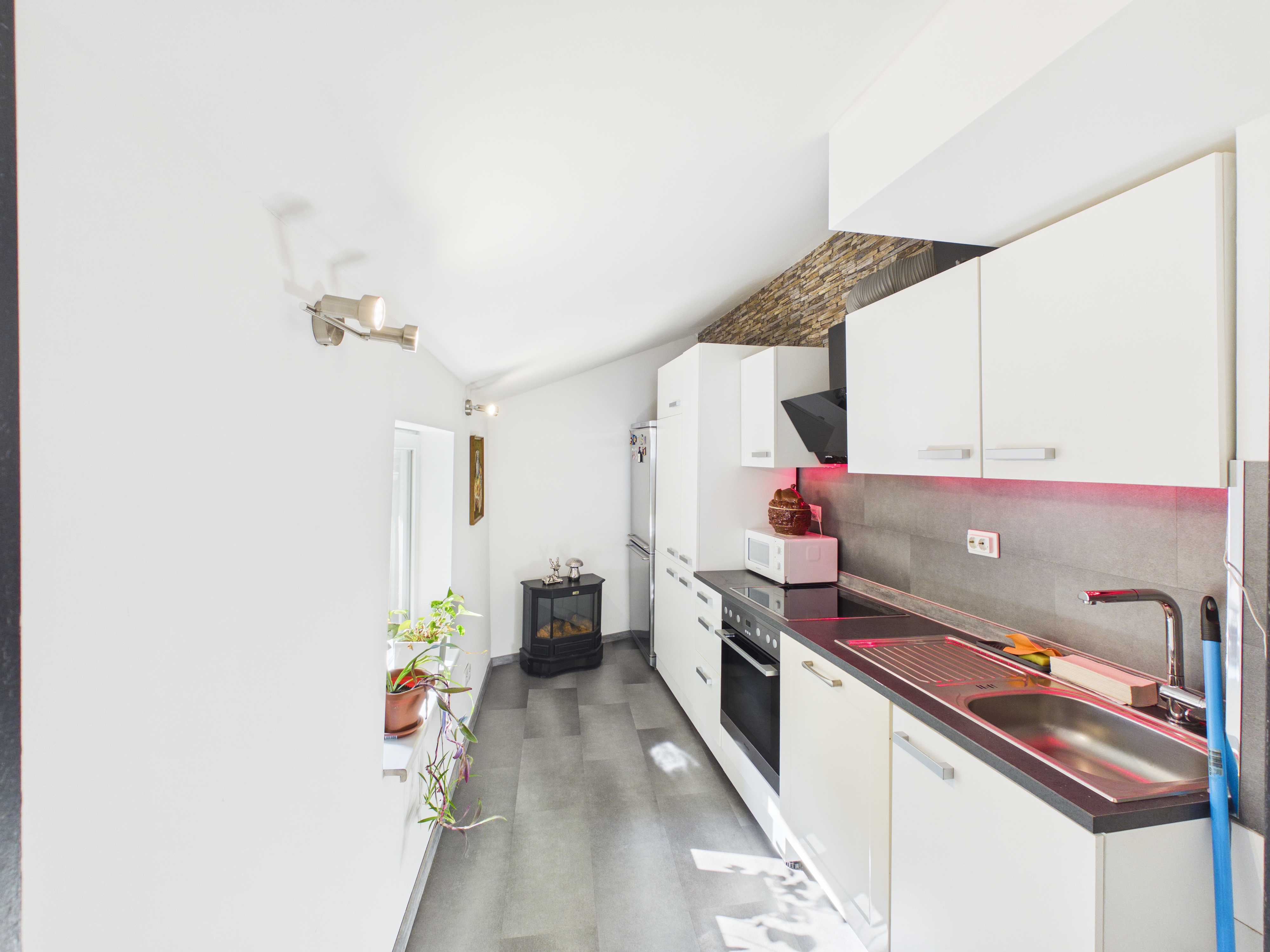 Beim Betreten des Hauses gelangen Sie in den Eingangsbereich. Von hier aus erschließen sich rechts eine helle Küche mit angenehmen Tageslichteinfall sowie links ein grosszügiges Schlafzimmer. Ergänzt wird diese Etage durch ein praktisches Duschbad entlang des Flures.
