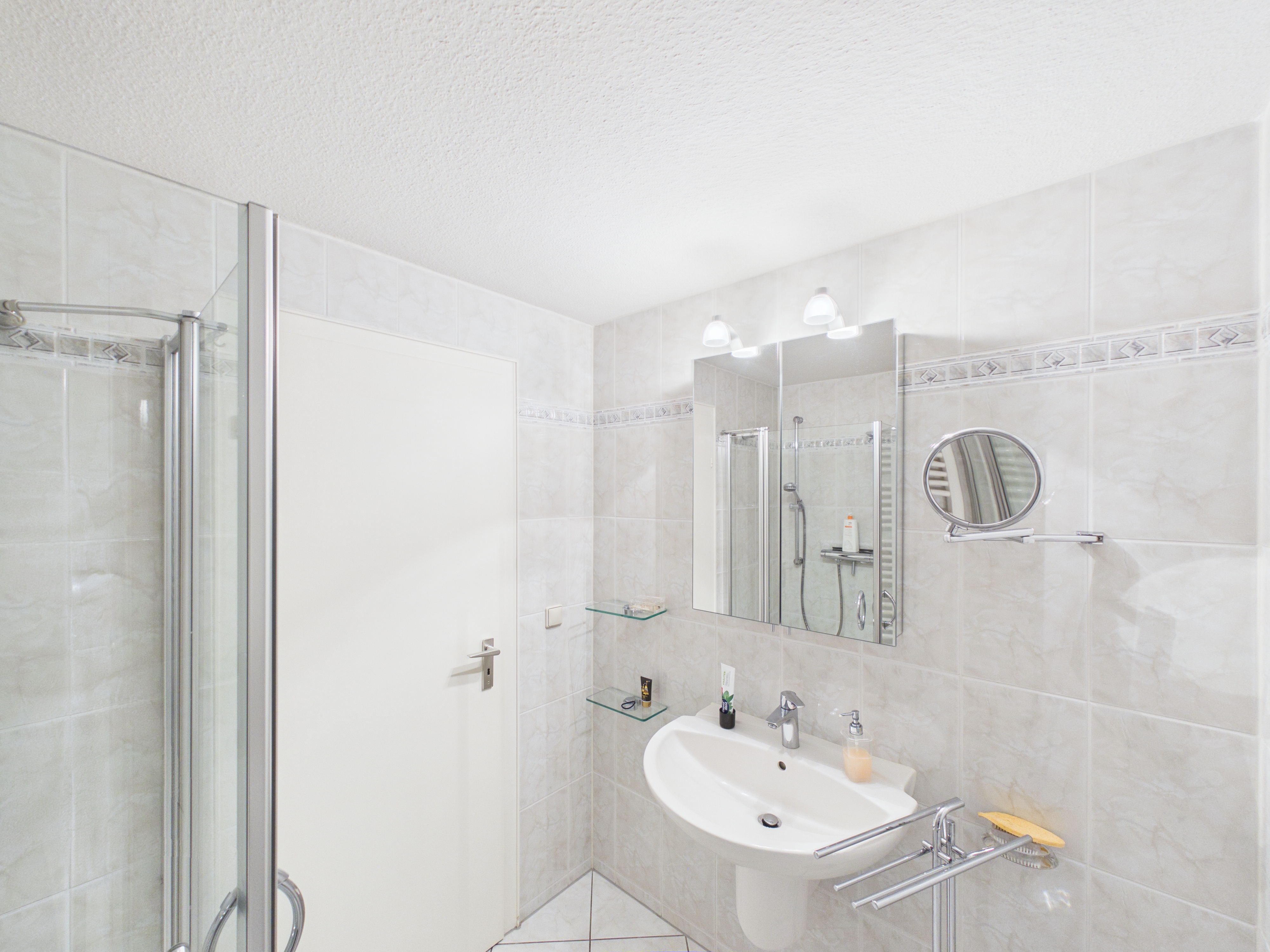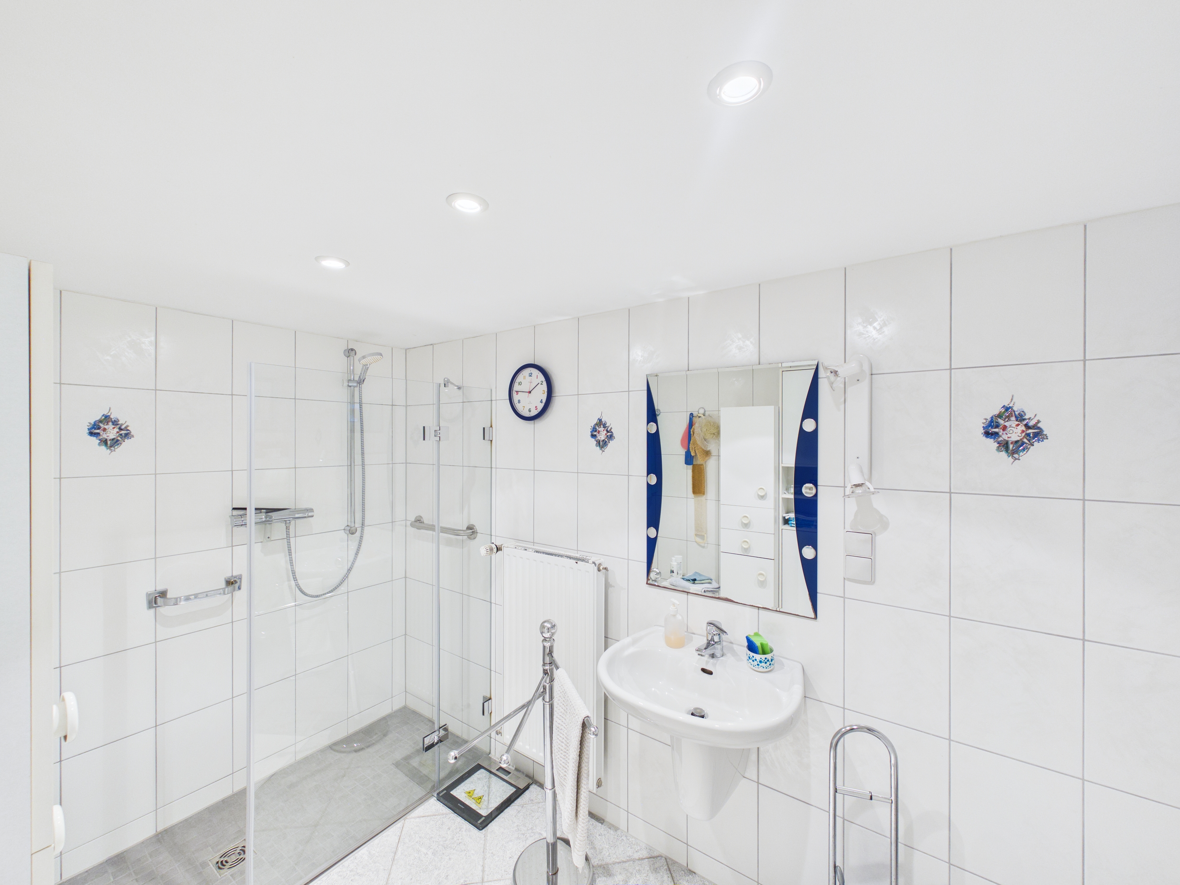 Ein renoviertes Badezimmer mit bodentiefer Dusche sowie ein separater Zugang zum Garten ermöglichen eine flexible Nutzung dieses Bereichs – ideal auch für Gäste oder als unabhängiger Wohnraum.