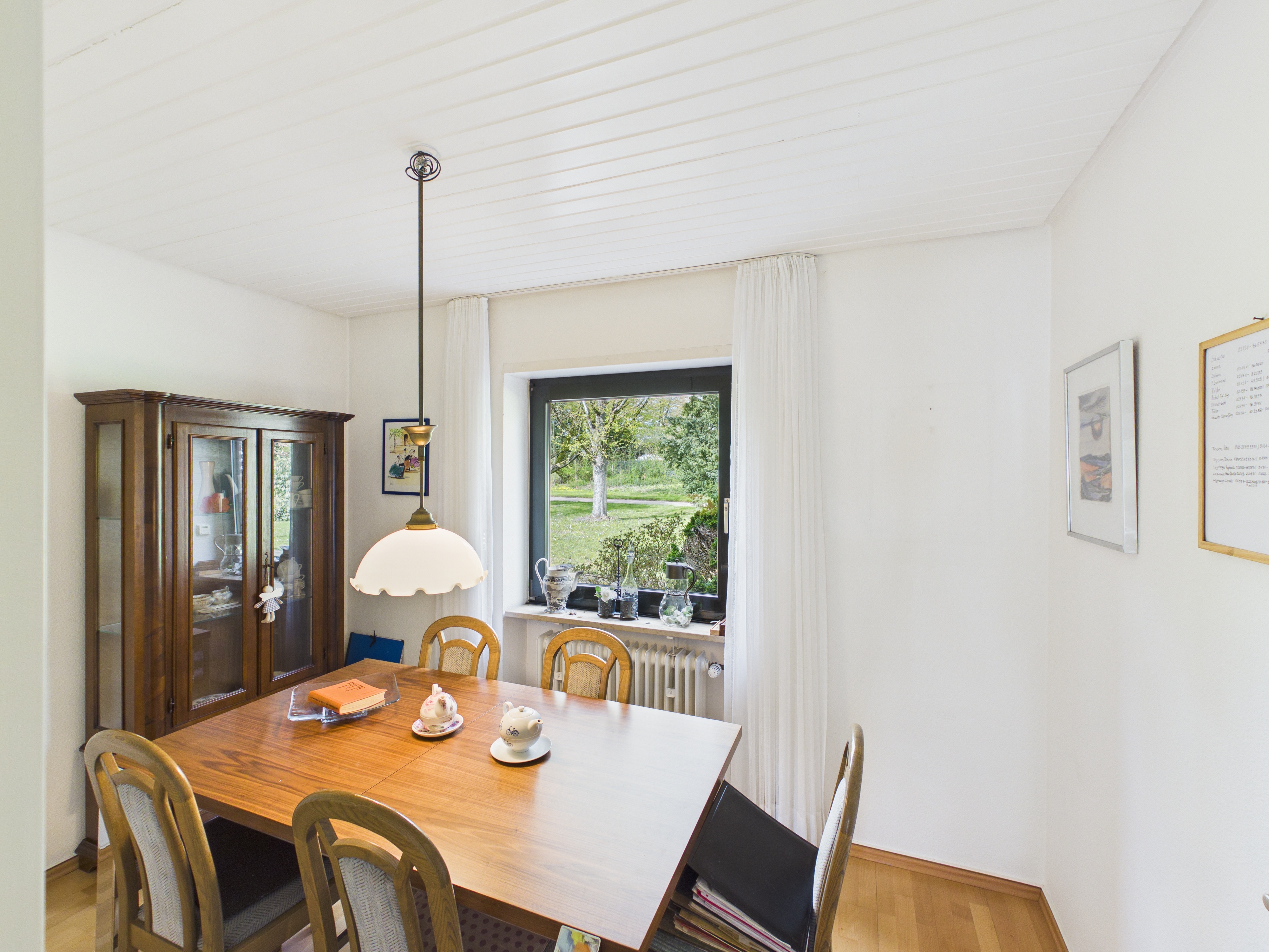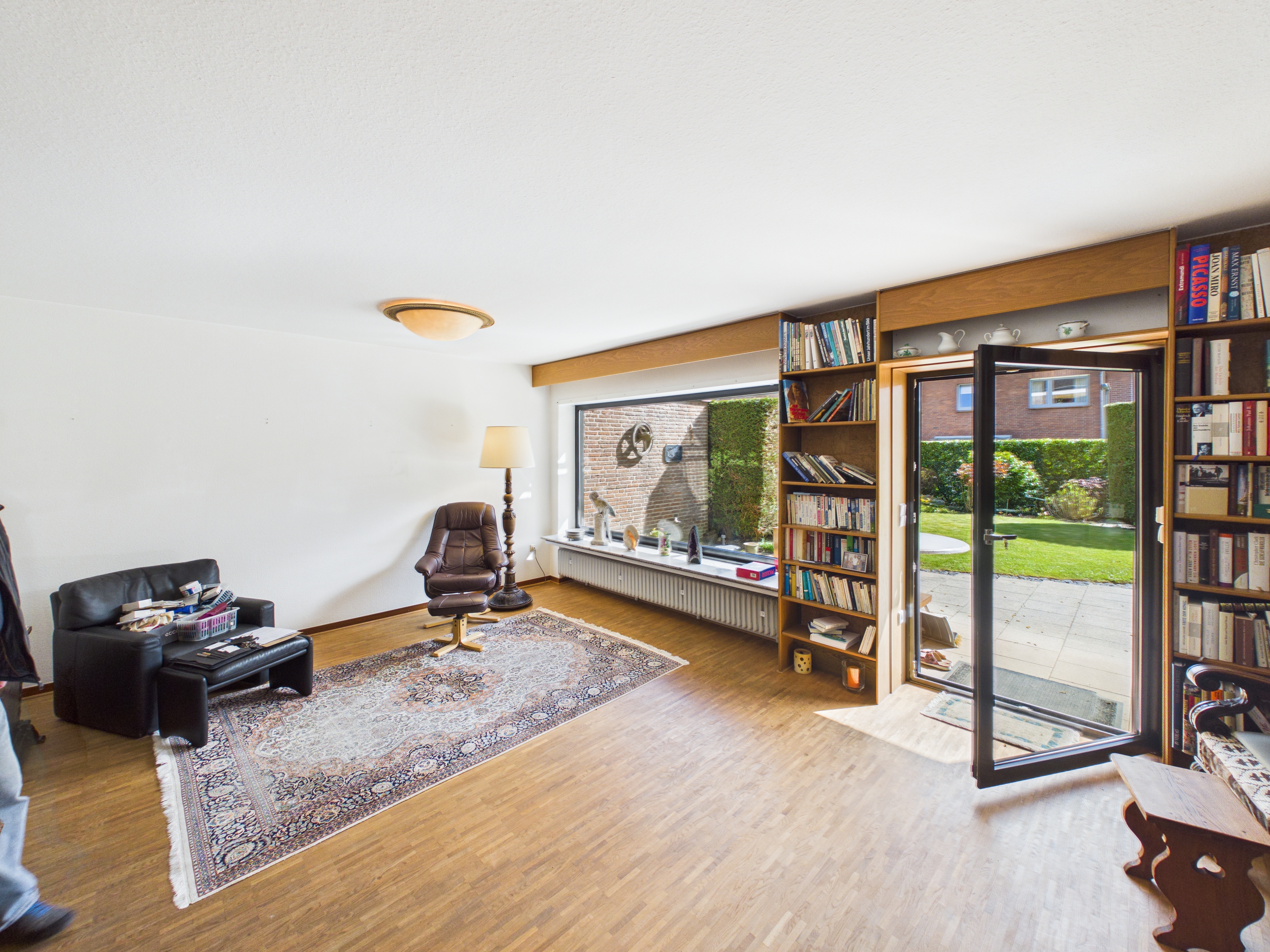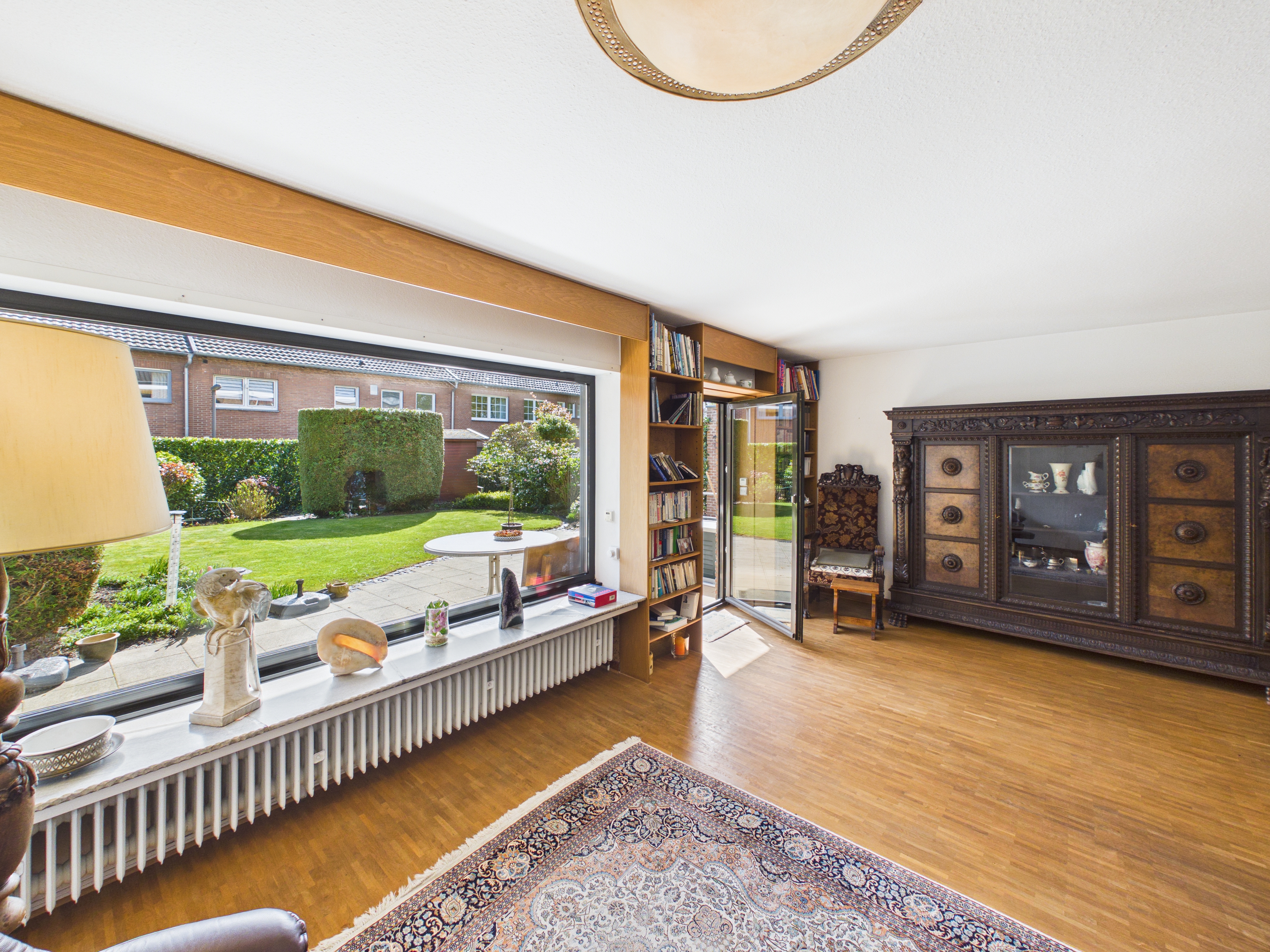 Bereits beim Betreten empfängt Sie eine einladende, großzügige Diele, die als zentraler Zugang zu allen weiteren Räumen dient. Das helle Wohnzimmer mit großen Fensterfronten wird von Tageslicht durchflutet und schafft eine warme, behagliche Atmosphäre. Von hier aus genießen Sie einen wunderschönen Blick in den liebevoll angelegten Garten – ein echtes Paradies für Kinder, entspannte Stunden im Freien und gesellige Momente mit Familie und Freunden.