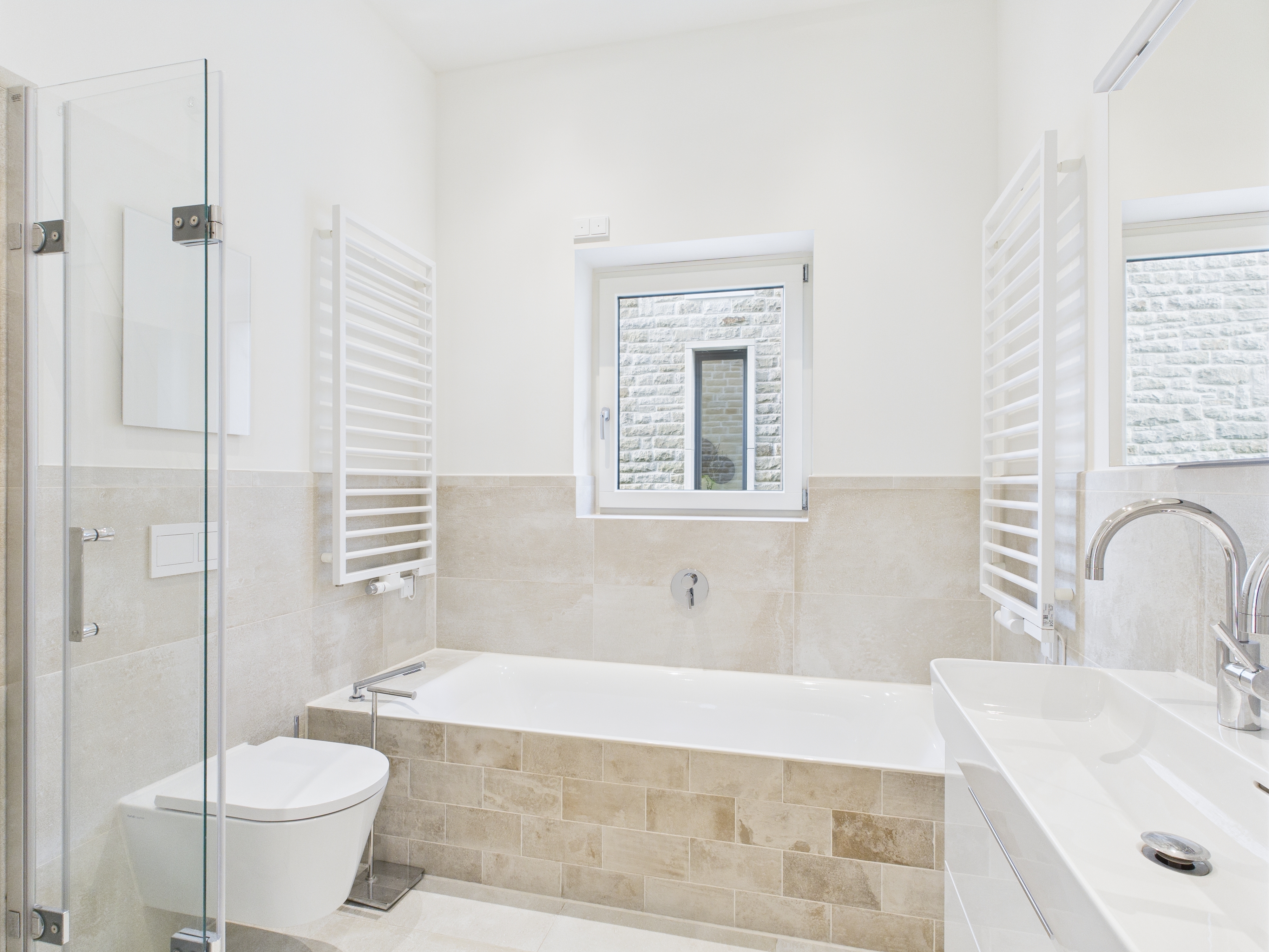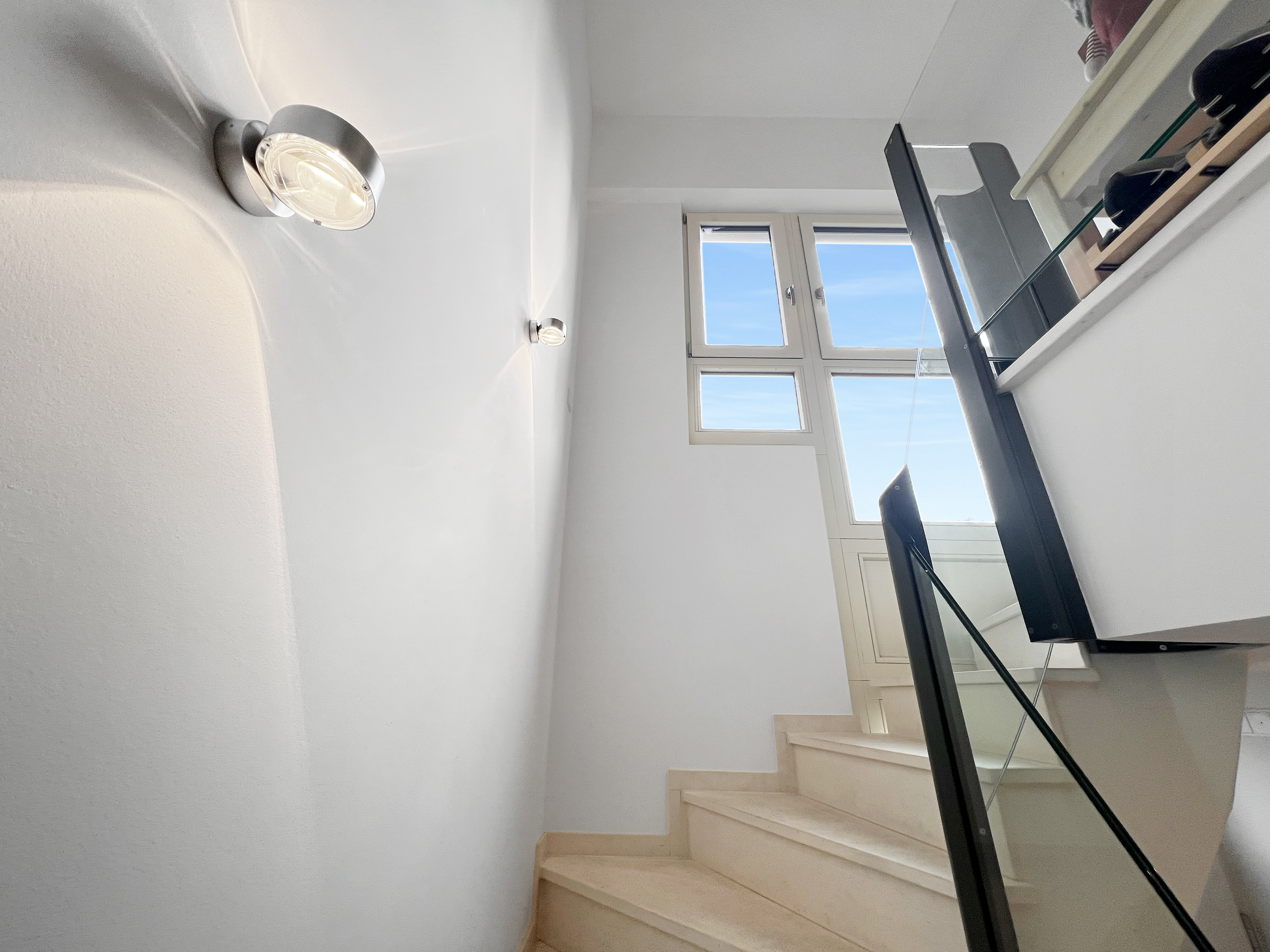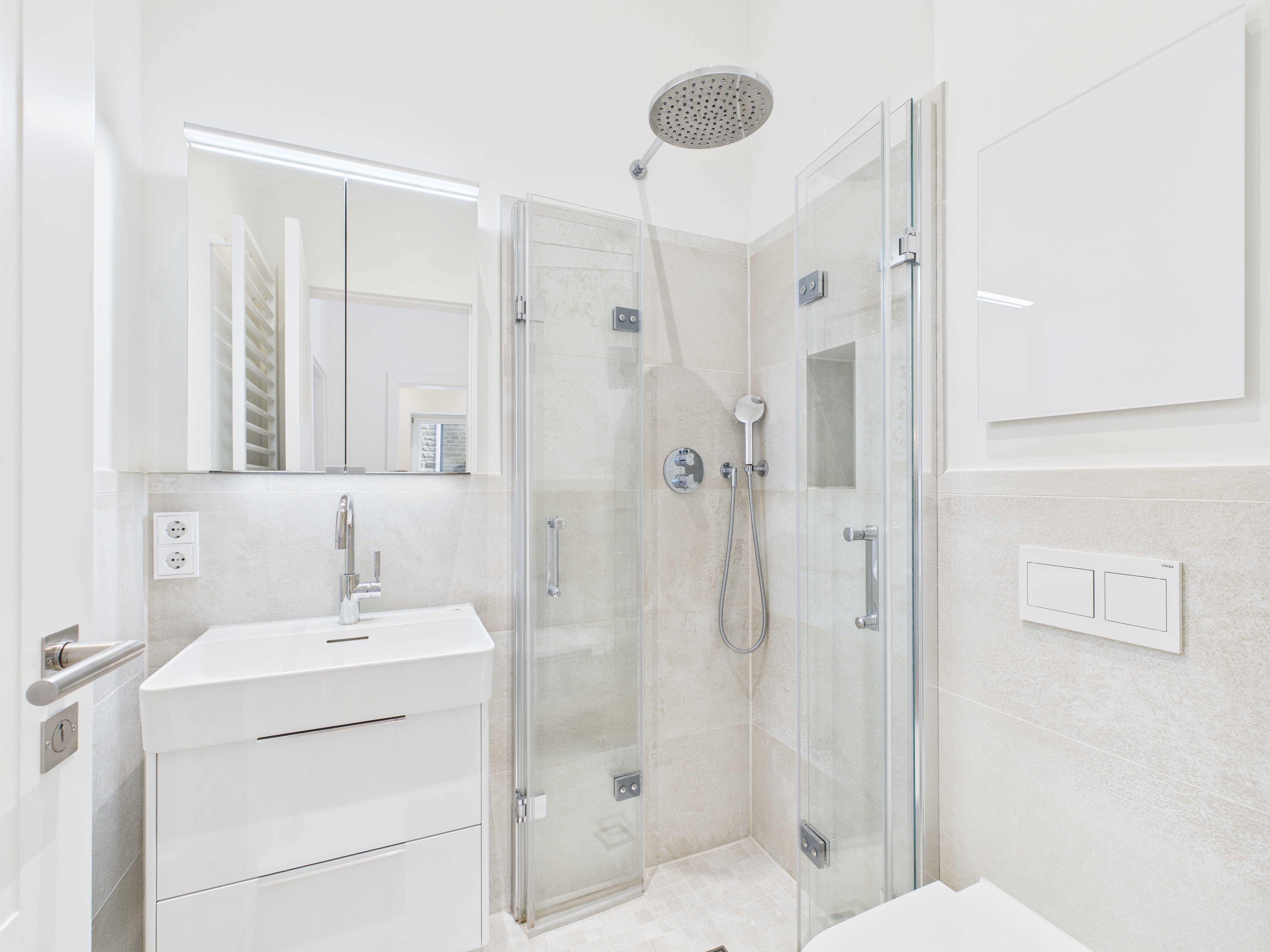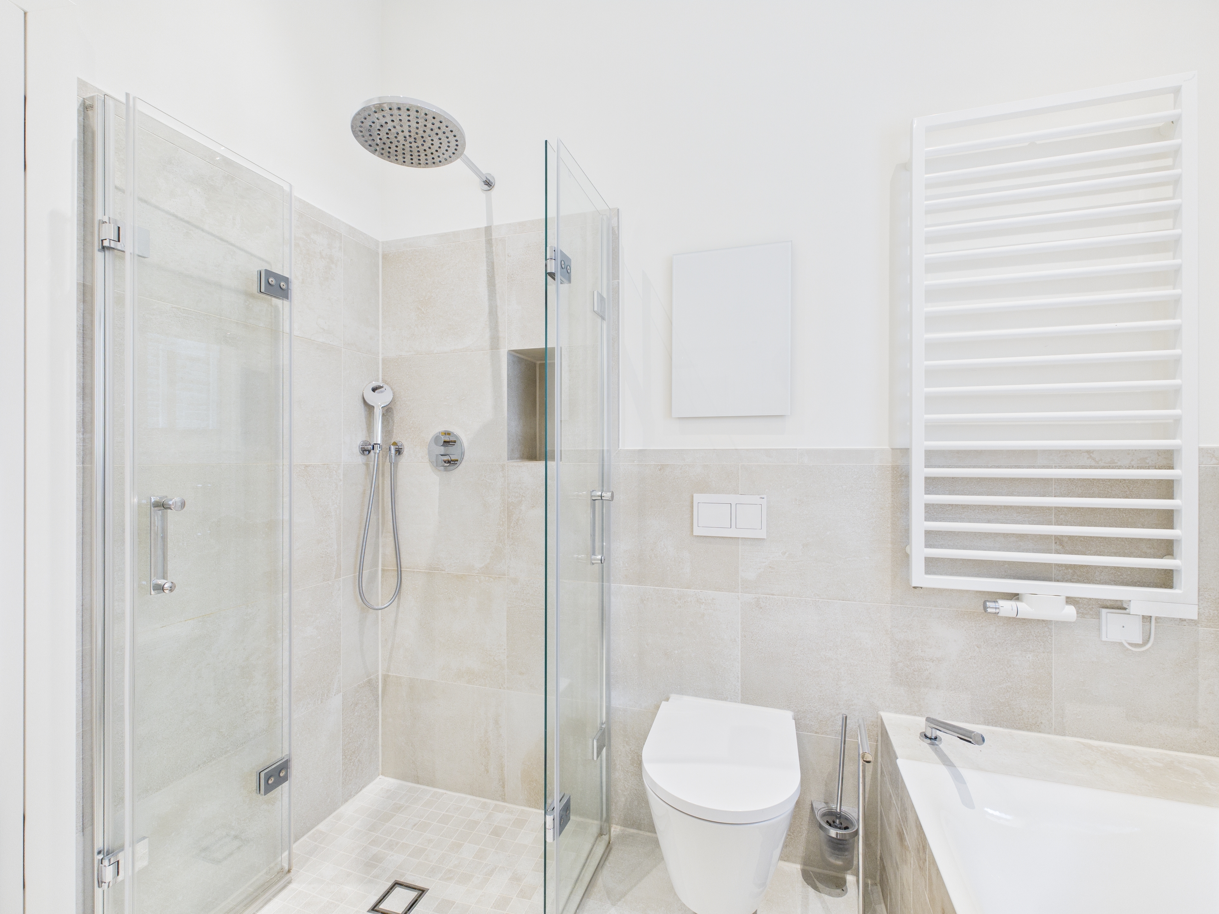 Die Ausstattung der Wohnung ist von höchster Qualität: Echtholz-Eichendielen schaffen eine warme Atmosphäre, während moderne Bussysteme Licht, Steckdosen und Rollläden steuern. Die Beheizung erfolgt über eine effiziente Sole-Wärmepumpe mit Gasbegleitheizung (Fußbodenheizung), unterstützt durch eine mechanische Lüftungsanlage mit Wärmerückgewinnung und einer Kühlfunktion für den Sommer. Eine hochmoderne Alarmanlage sorgt für Sicherheit und sorgt für zusätzliche Ruhe.