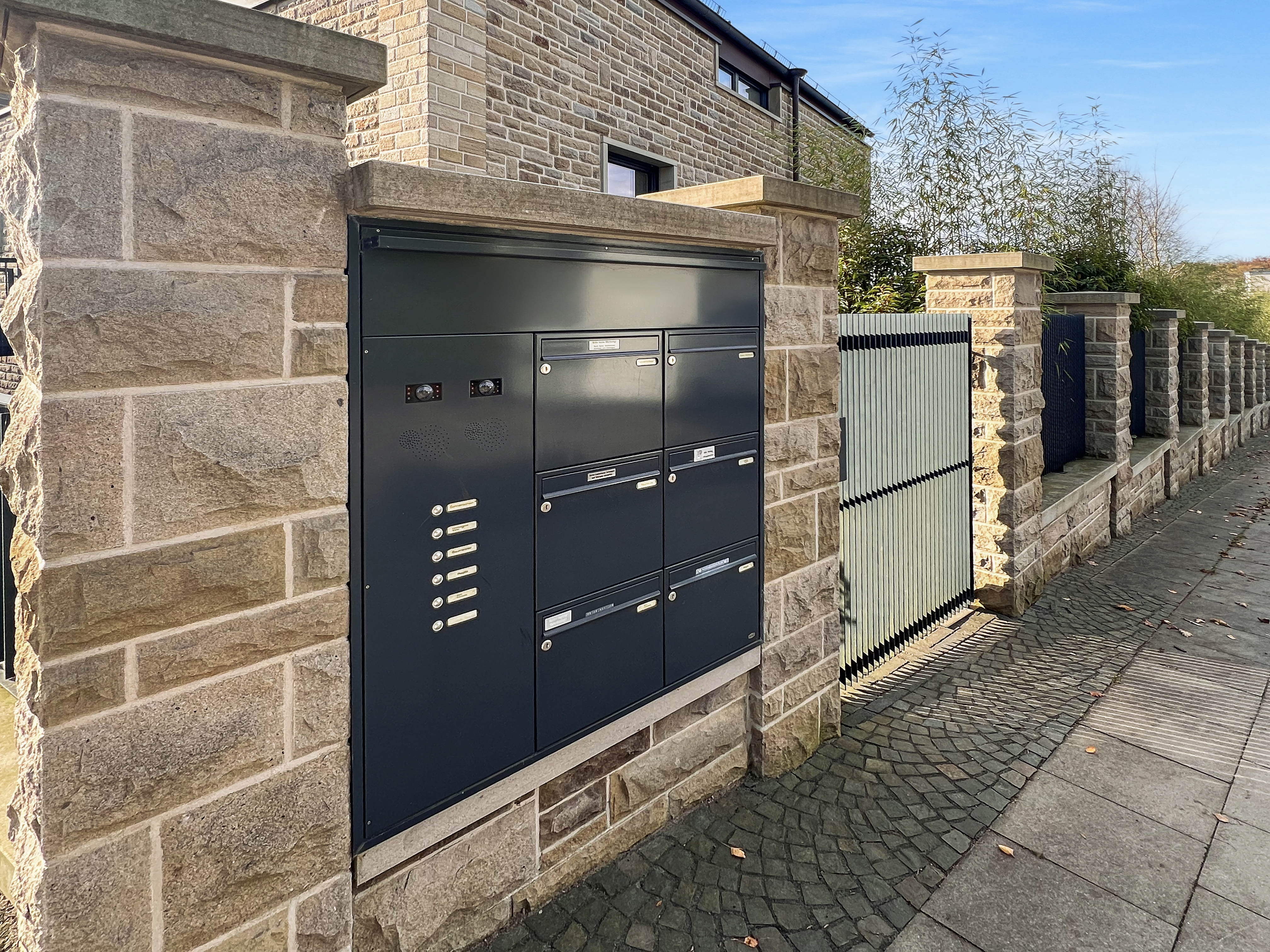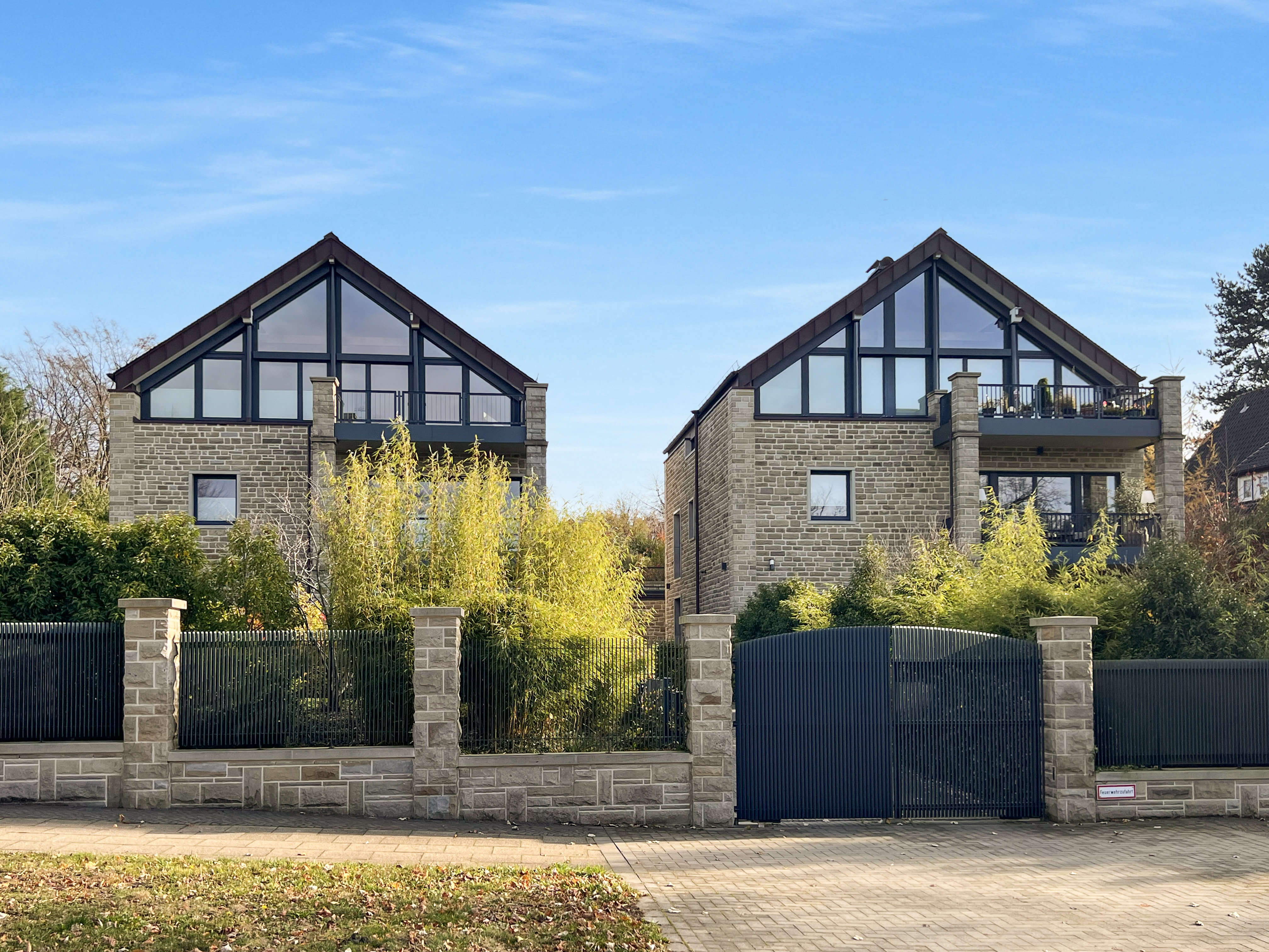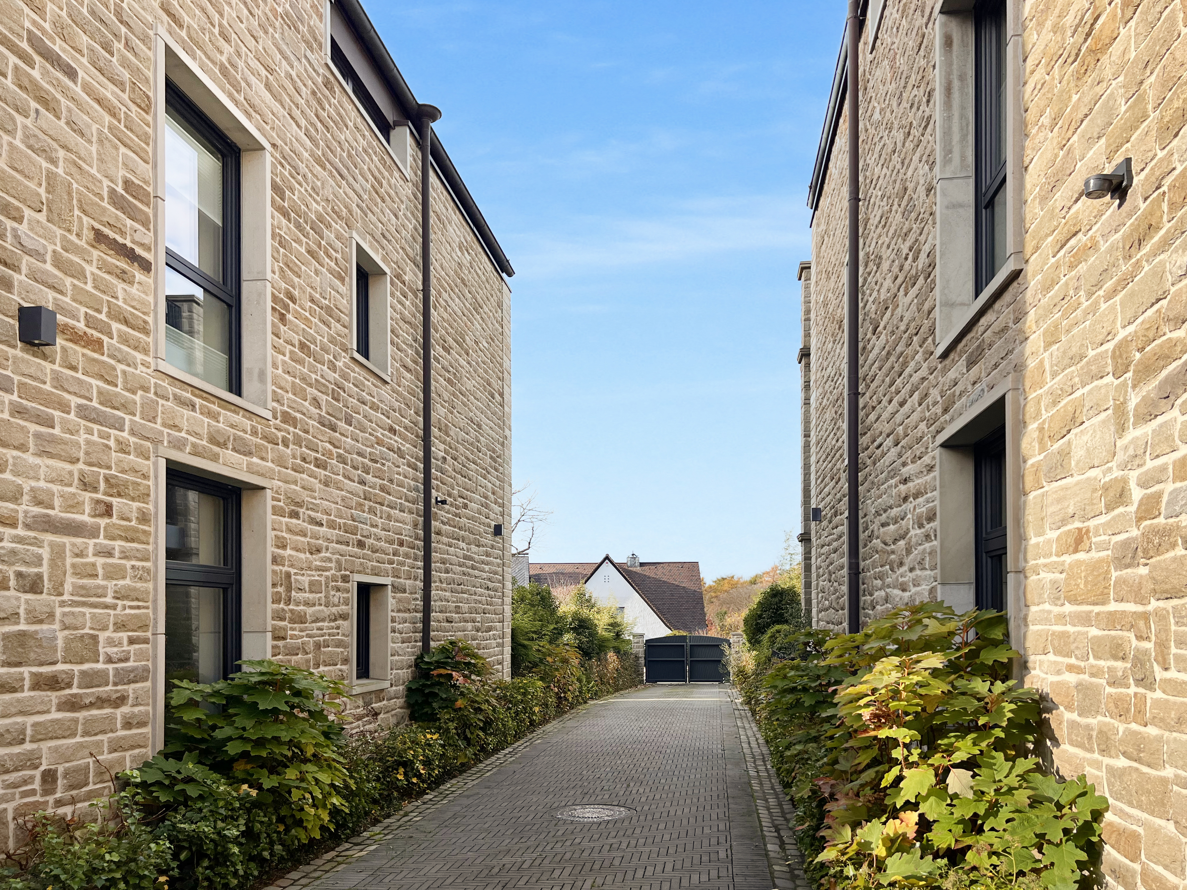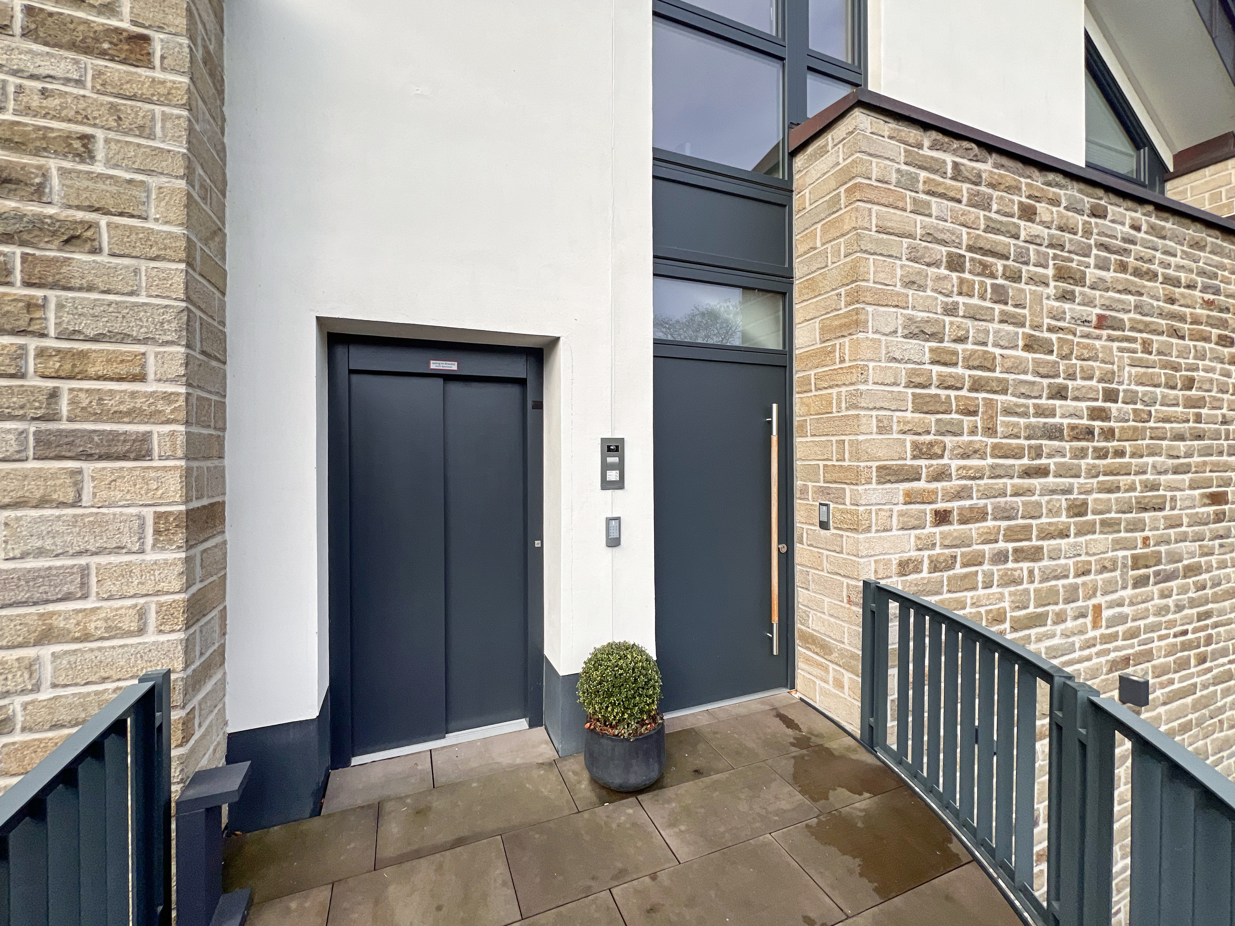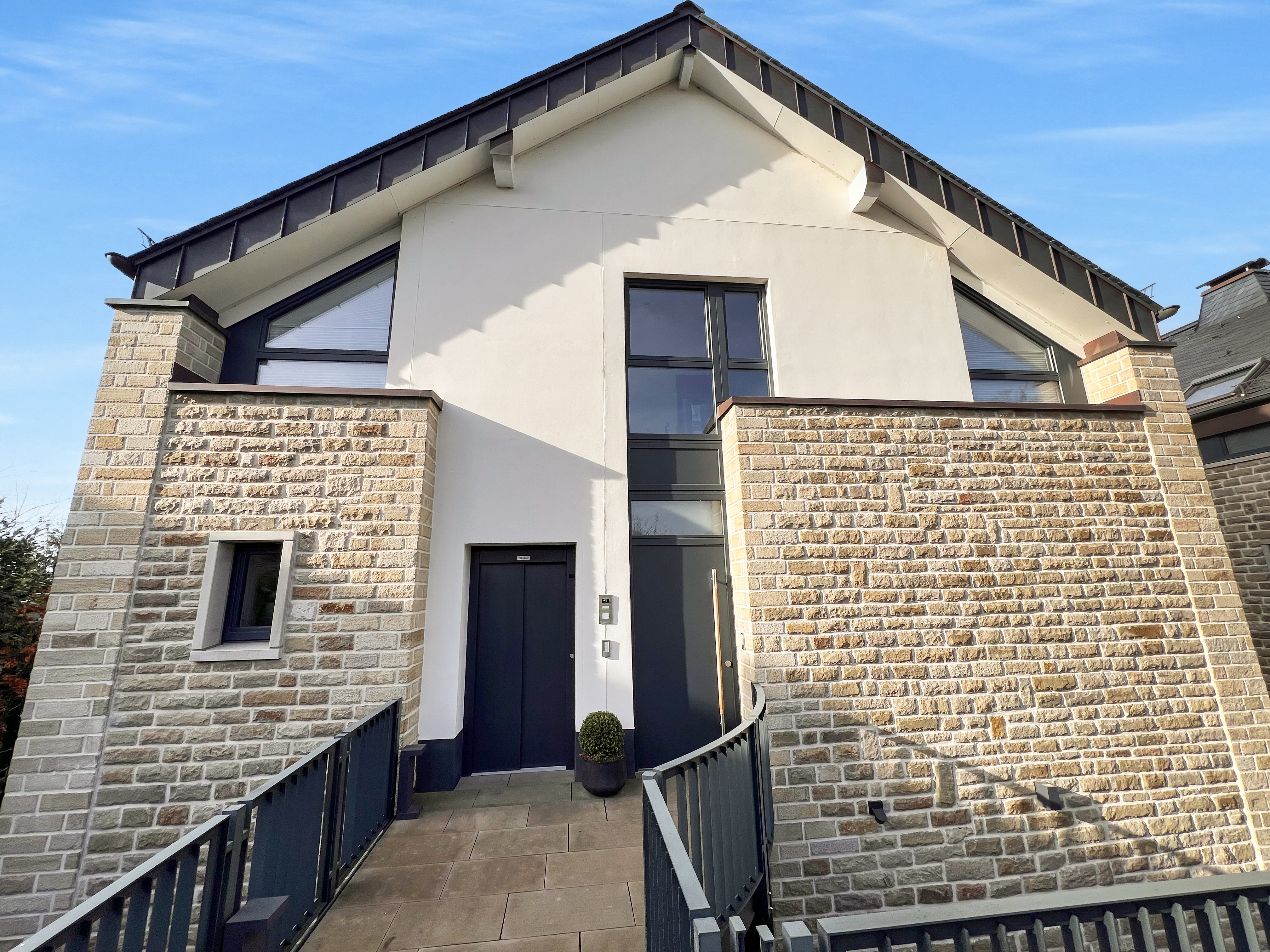 Die Fassade des Gebäudes ist mit hochwertigem Bruchstein verkleidet, was nicht nur für eine edle Optik sorgt, sondern auch für hervorragende Isolation. Das Brucker Holter Viertel selbst bietet eine ruhige und grüne Umgebung mit exzellenter Anbindung an städtische Einrichtungen und Annehmlichkeiten.